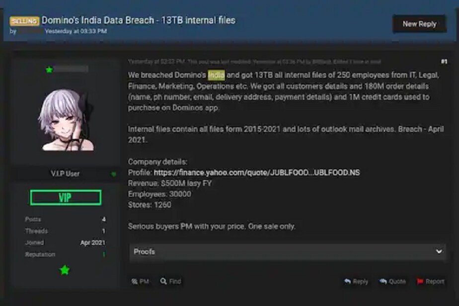 ಸೌರಜೀತ್ ಮಜುಂದರ್ ಎಂಬವರು ಈ ಡೇಟಾ ಲೀಕ್ ಆಗಿರುವ ಬಗ್ಗೆ ವರದಿ ಮಾಡಿದ್ದಾರೆ. ಡೊಮಿನೊಸ್ ಪಿಜ್ಜಾ ಕಂಪನಿ ಮತ್ತು ಸೆರ್ಟ್-ಇನ್ ಅಧಿಕಾರಿಗಾಳಿಗೆ ತಿಳಿಸಿದ್ದಾರೆ. ಮಾಹಿತಿಗಳ ಪ್ರಕಾರ ಹ್ಯಾಕರ್ಸ್ ಡೊಮಿನೊಸ್ ಇಂಡಿಯಾದ 50 ಟಿಬಿಸಿ (ಪ್ರಕಟನೆ ಅಂದಾಜು 21,3 ಕೋಟಿ) ಯಷ್ಟು ಸುಲಿಗೆ ಮಾಡಿದ್ದಾರೆ ಎಂದು ತಿಳಿದುಬಂದಿದೆ.